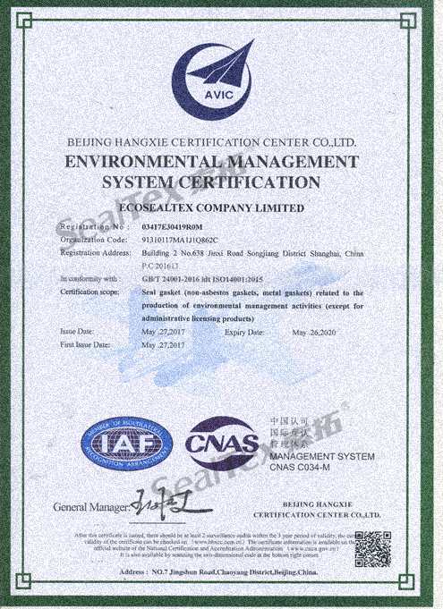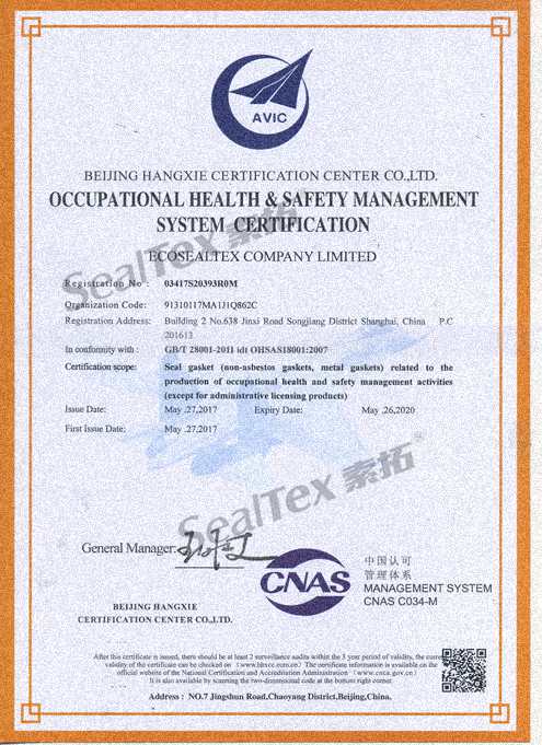 為了更好的推動(dòng)“禁止使用石棉制品”進(jìn)程、推進(jìn)環(huán)保事業(yè)、樹立企業(yè)形象,我司于2017年通過了ISO14001環(huán)境管理體系及OHSAS18001職業(yè)健康安全管理體系的認(rèn)證并獲得認(rèn)證證書。