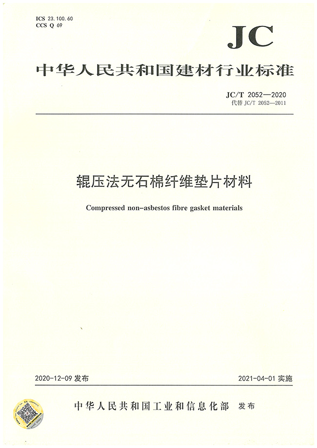JC/T 2052-2020《輥壓法無(wú)石棉纖維墊片材料》標(biāo)準(zhǔn)的第三起草單位。