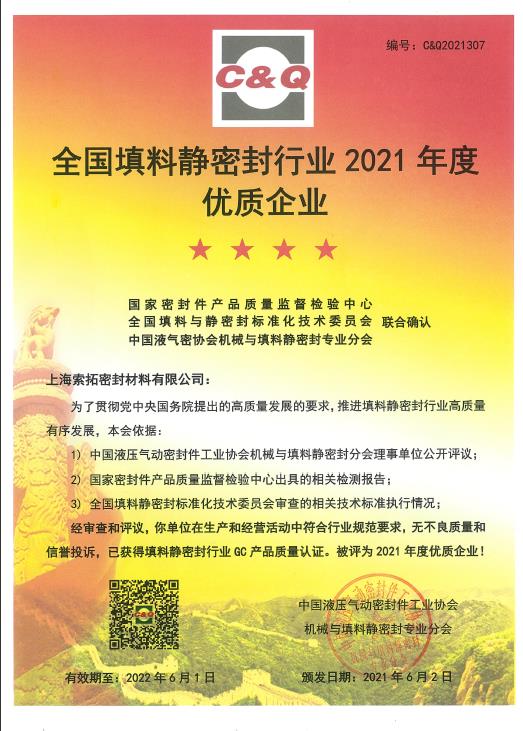我司獲得全國填料靜密封行業(yè)2021年度優(yōu)質(zhì)企業(yè)稱號(hào)
