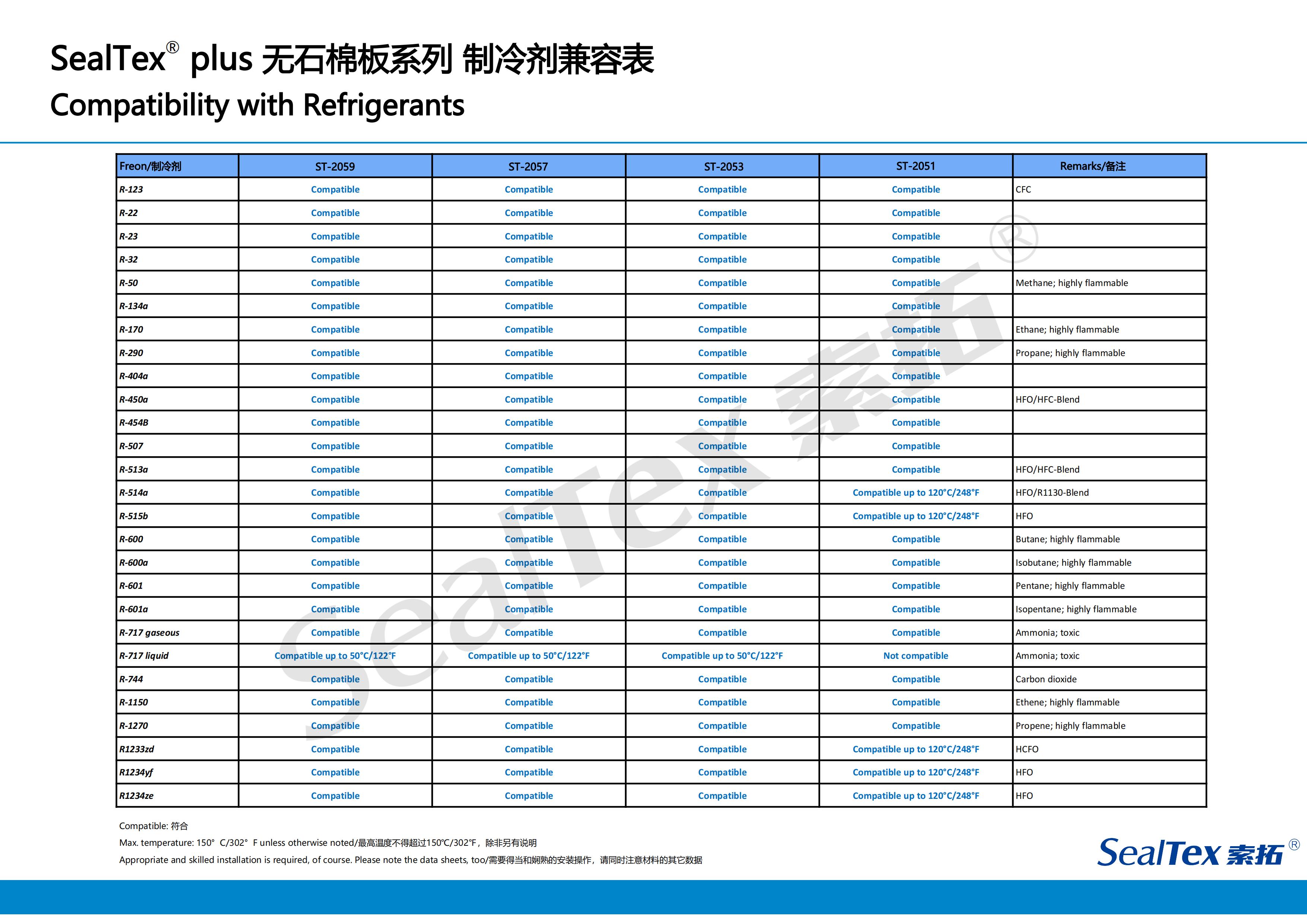 對于密封式和半密封式制冷壓縮機來說,每類制冷壓縮機可能會用到不同的制冷劑,一個能完全遏止制冷劑的可靠性密封系統是決定壓縮機長期穩定運轉的重要因素。SealTex索拓公司為滿足制冷壓縮機用戶的要求,特別推出能在各種法蘭壓力下保持卓越密封性能的無石棉密封材料以滿足市場的需求。這些產品非常適用于半密封式壓縮機、冷卻裝置,對螺桿式和往復式壓縮機的應用尤其適合。例如:ST-2059ST-2057ST-2053ST-2051.