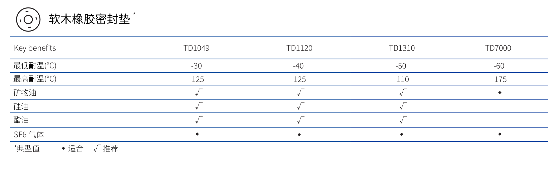 AMORIM阿莫林軟木橡膠密封材料TD1120、TD1049、TD1310、TD7000因其良好的機械性能、耐變壓器油等特性廣泛應用于變壓器行業。詳細參數如下: