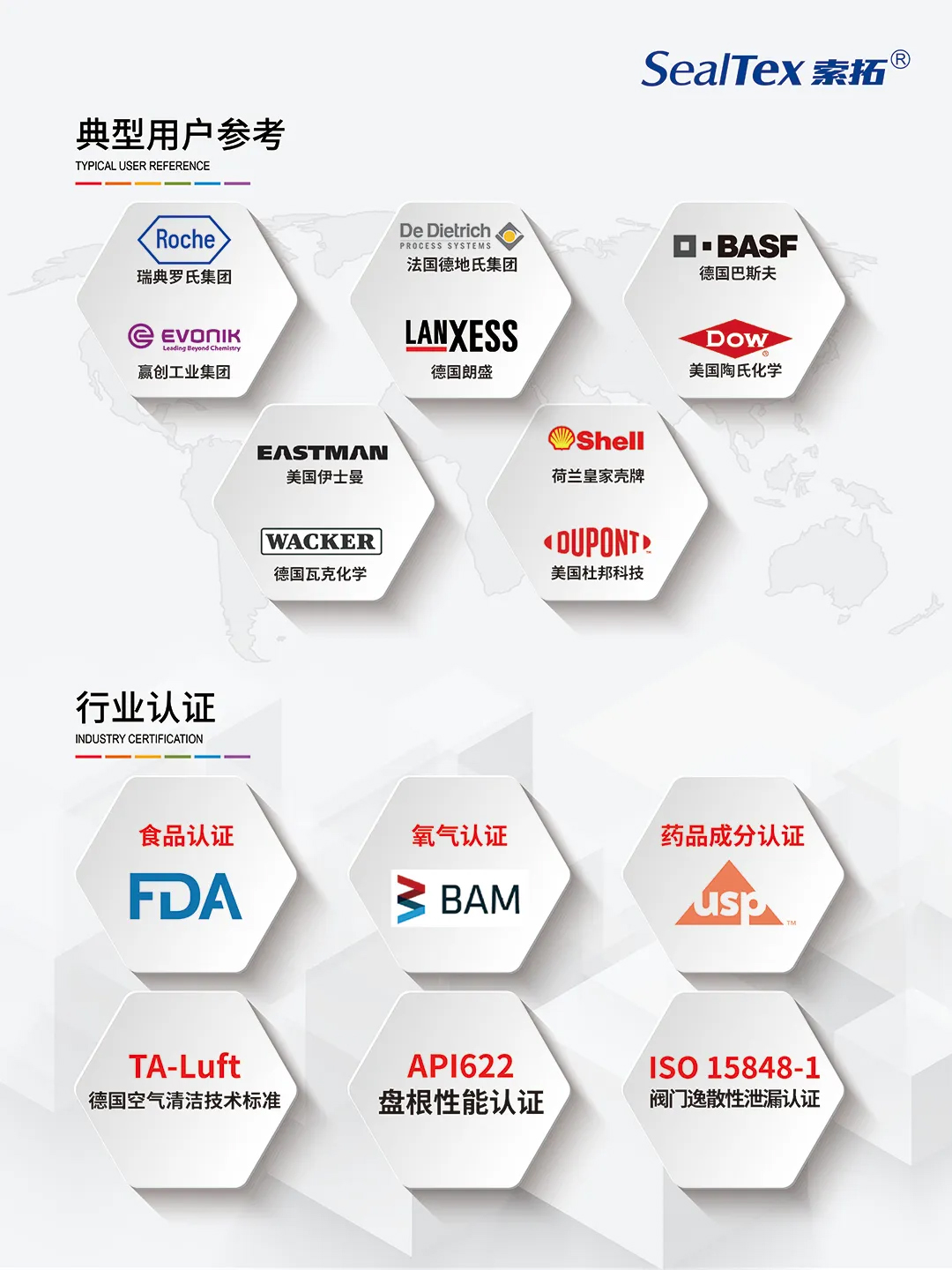 我司代理合作品牌TEADIT泰迪已為全球多家知名化工企業(yè)提供密封解決方案服務,例如:BASF巴斯夫、Shell殼牌、Roche羅氏等。且產(chǎn)品可滿足FDA、BAM、DVGW、ups、TA-Luft、API622、ISO 15848-1等不同標準要求。還在耐高溫、耐腐蝕等性能上表現(xiàn)出色,能夠滿足天然氣、石油、化工等嚴苛工況下的密封需求